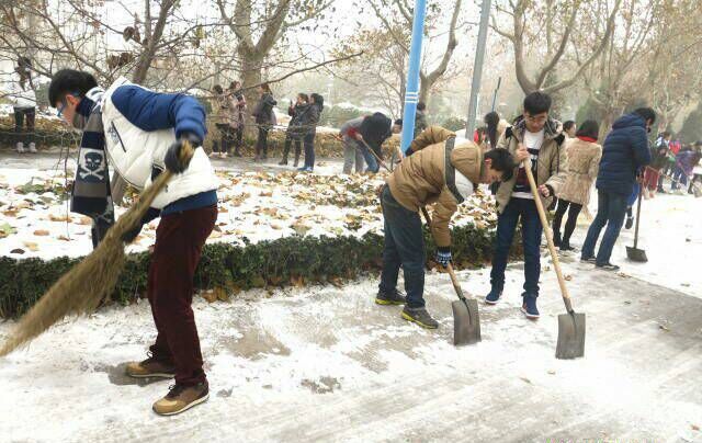 党委副书记耿会清和各班辅导员亲自到场组织指挥,全院学生共同参与,齐心协力清除积雪。
